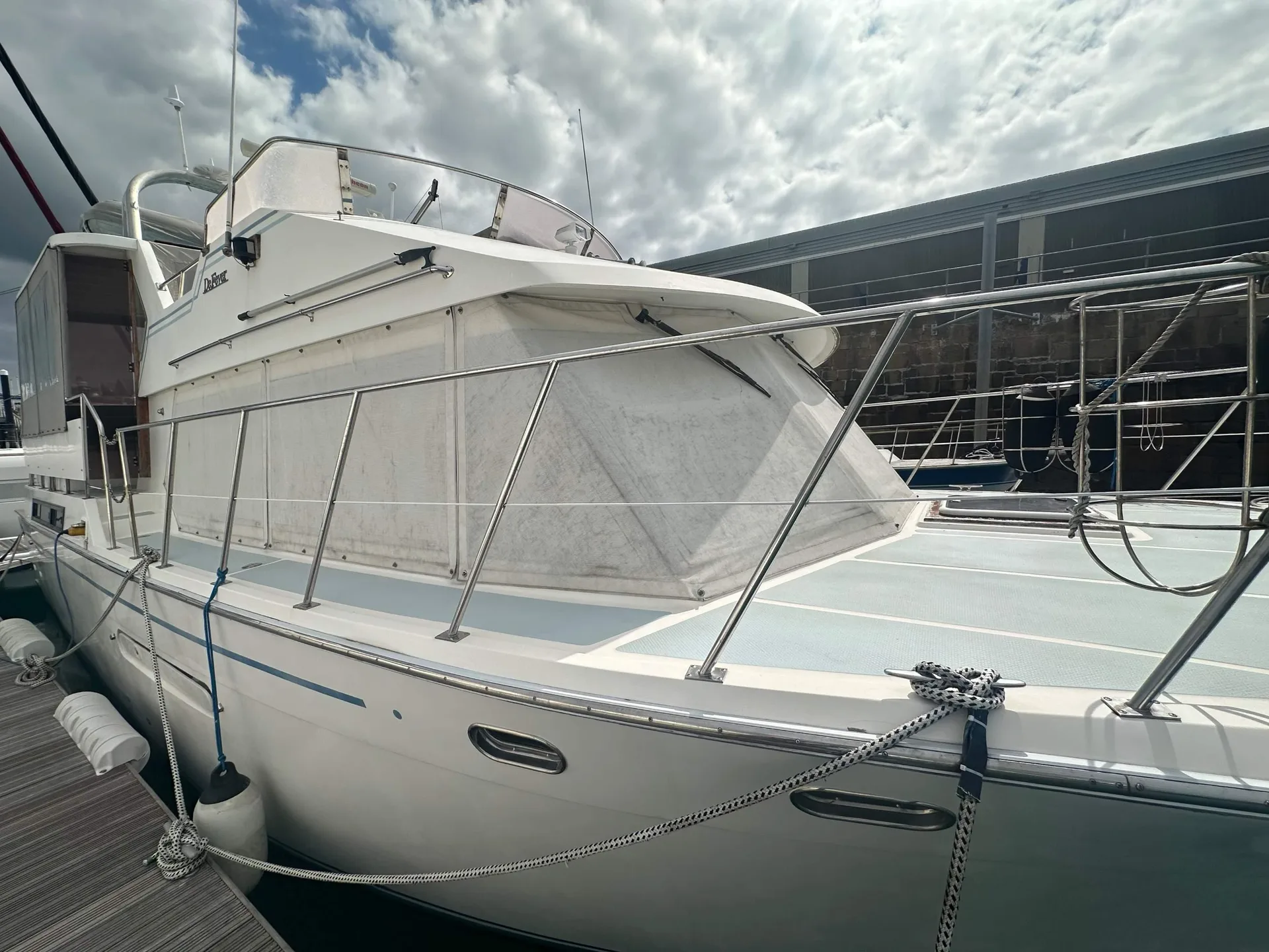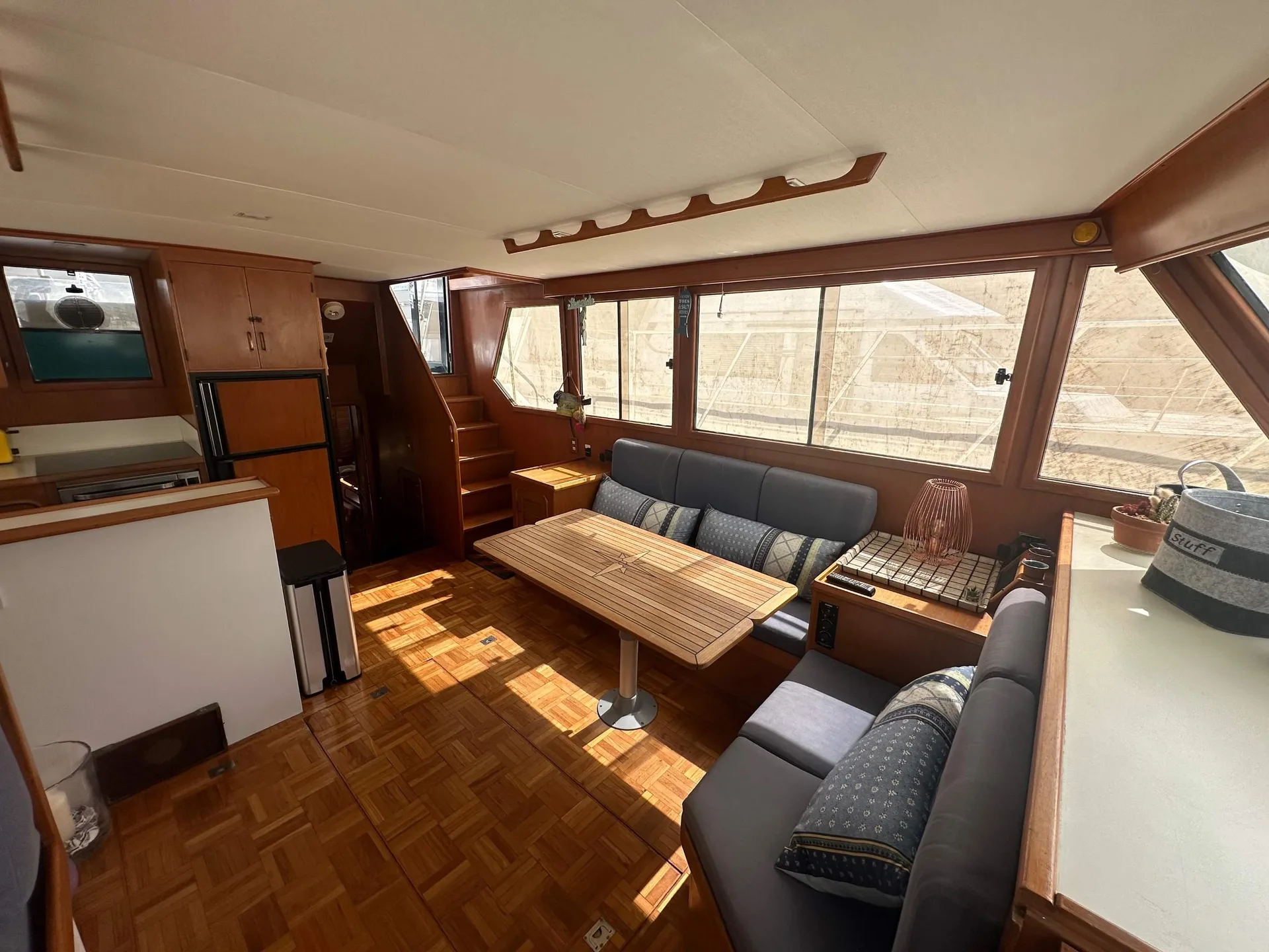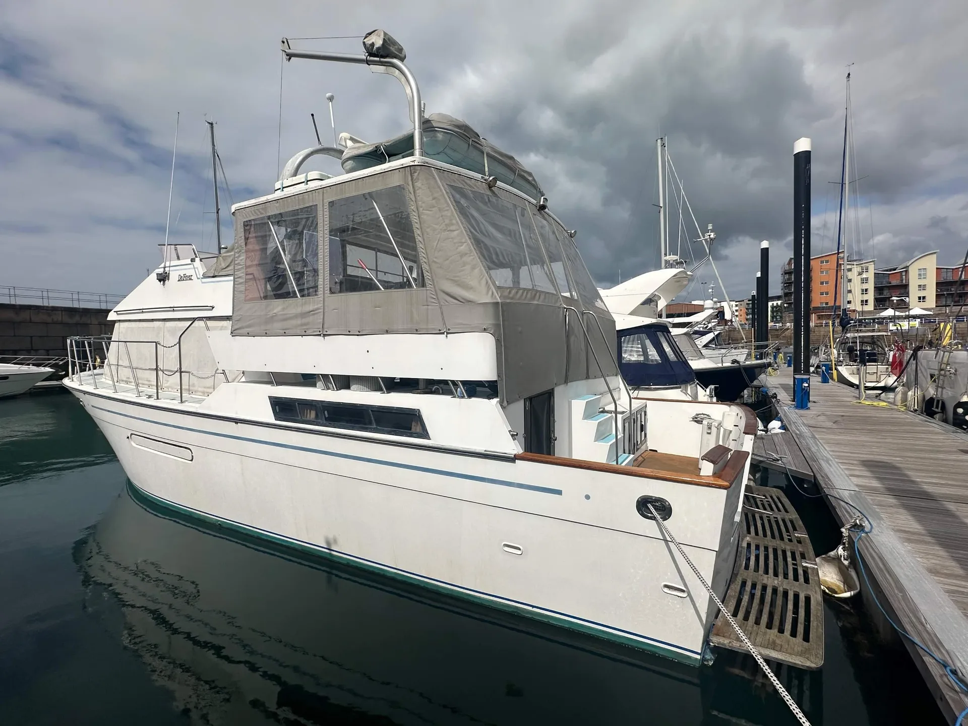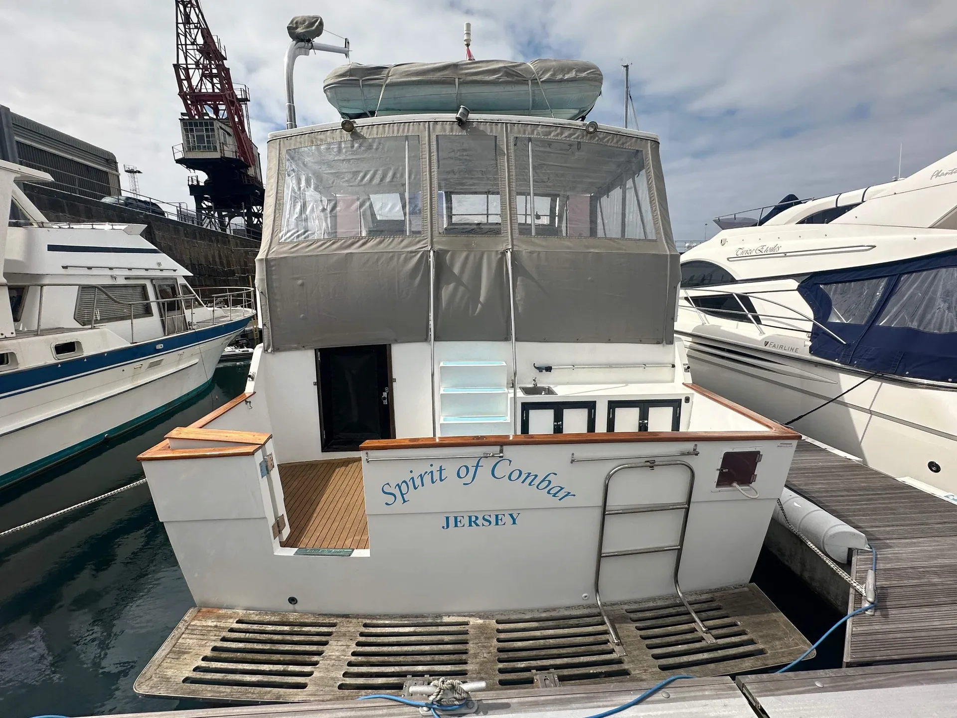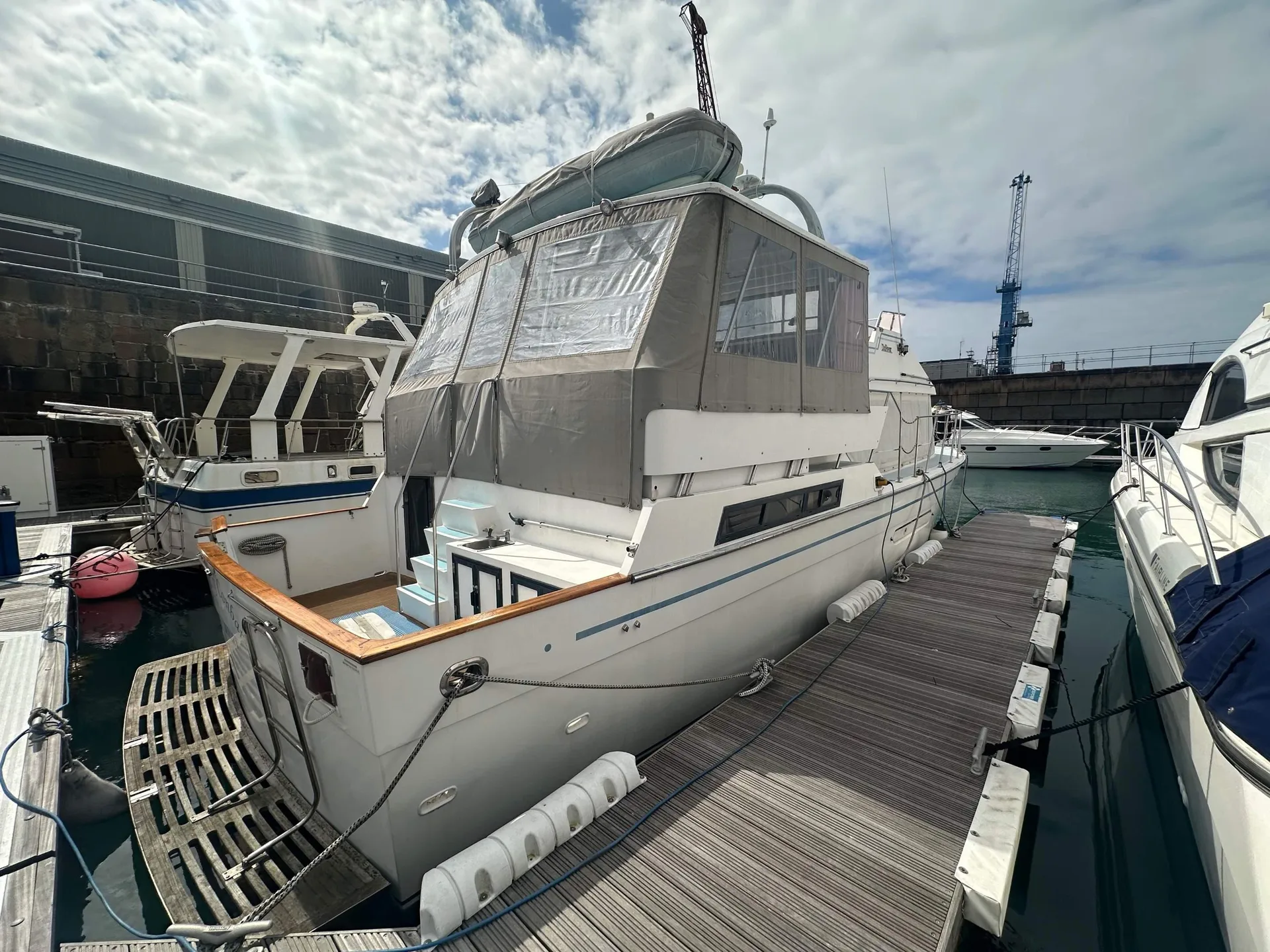 Description: A CLASSIC TRAWLER MOTOR YACHT with semi planing hull, excellent build quality and solid Burmese Teak cabinetry inside.Hull is strengthened with Kevlar in fibreglass mix & can take the ground. British Registered Part 1 in JERSEY. FULL R.C.D. APPROVAL CLASS B OFFSHORE . PORT ENGINE 1060 hours.STARBOARD ENGINE (new 2003) 320 hours. Many upgrades over the years.