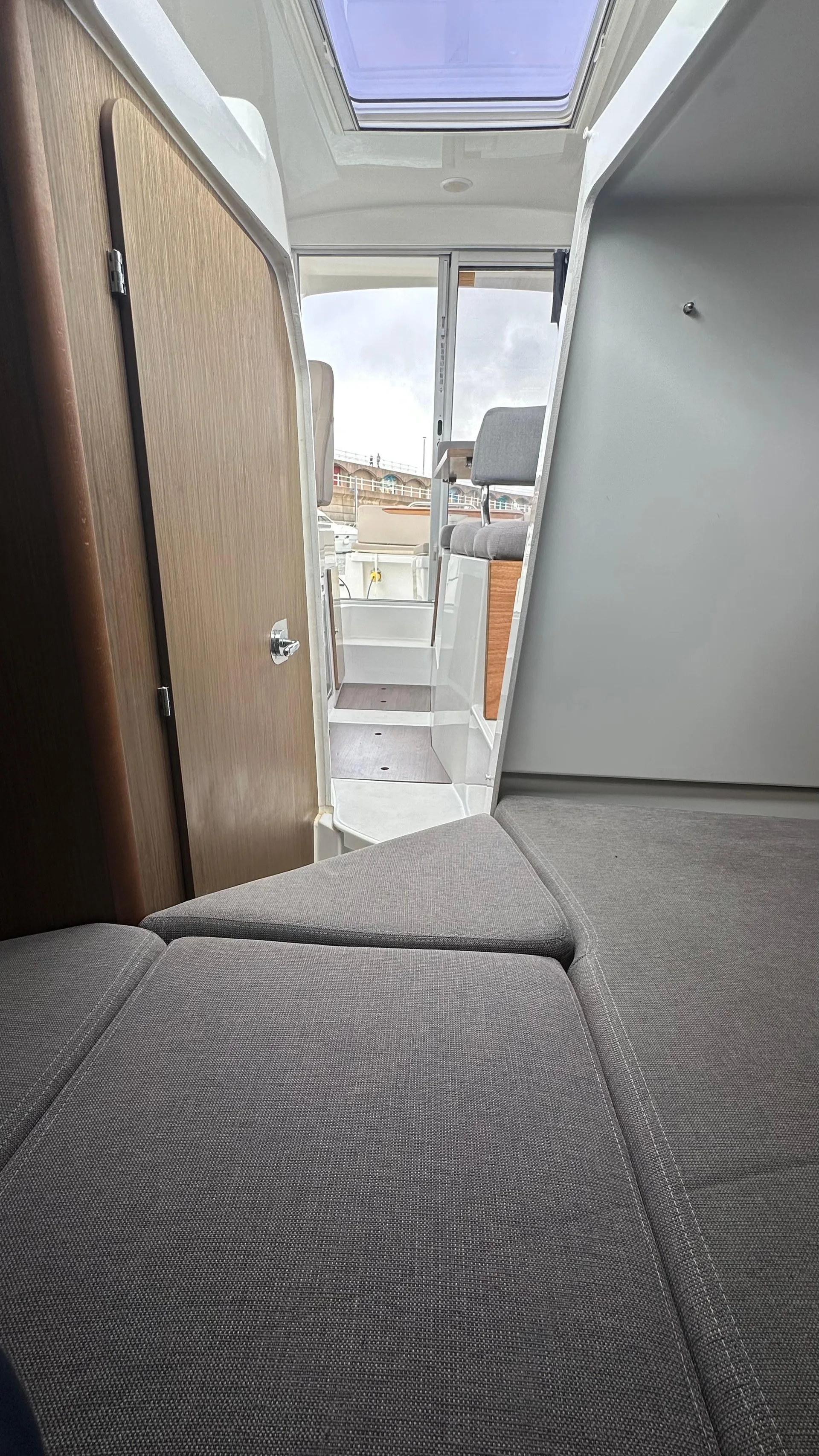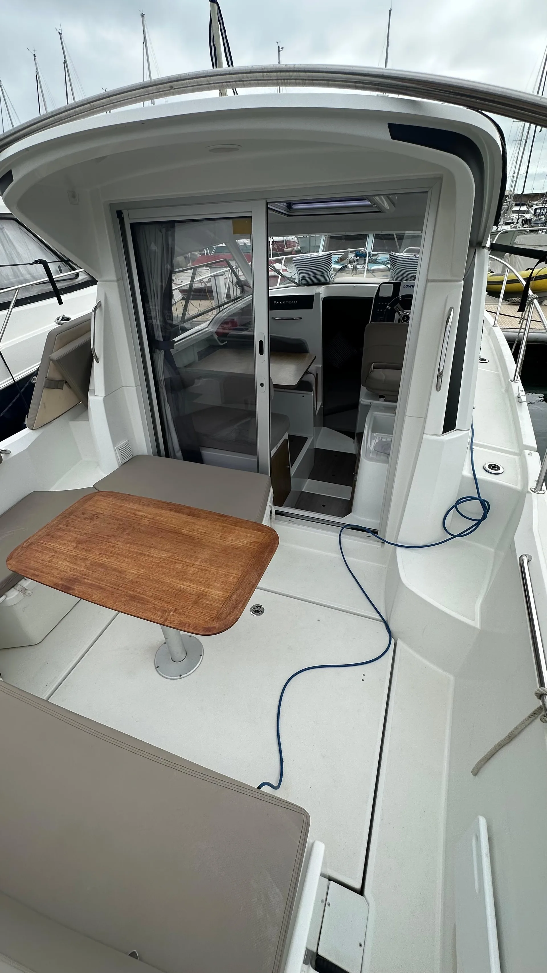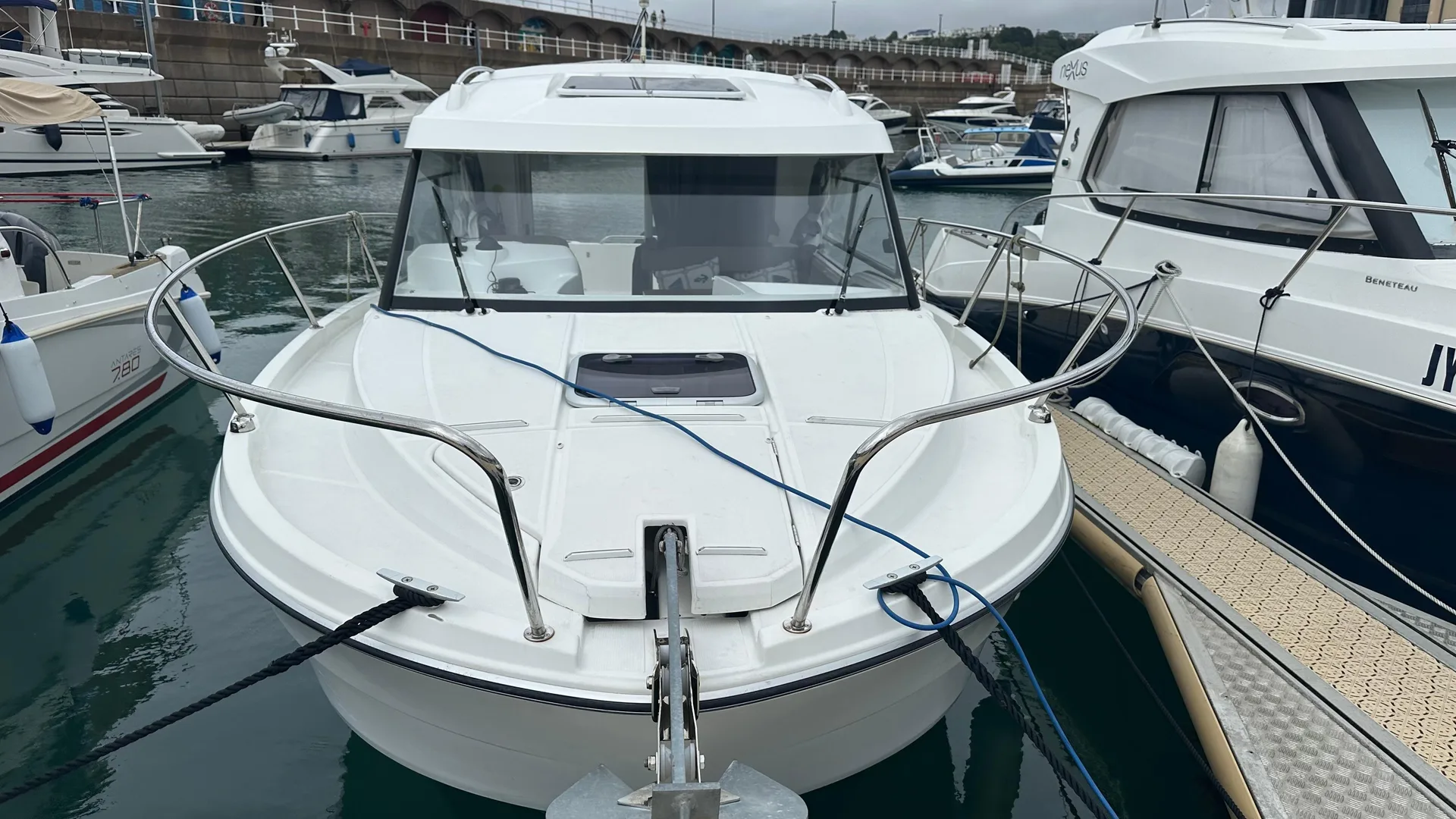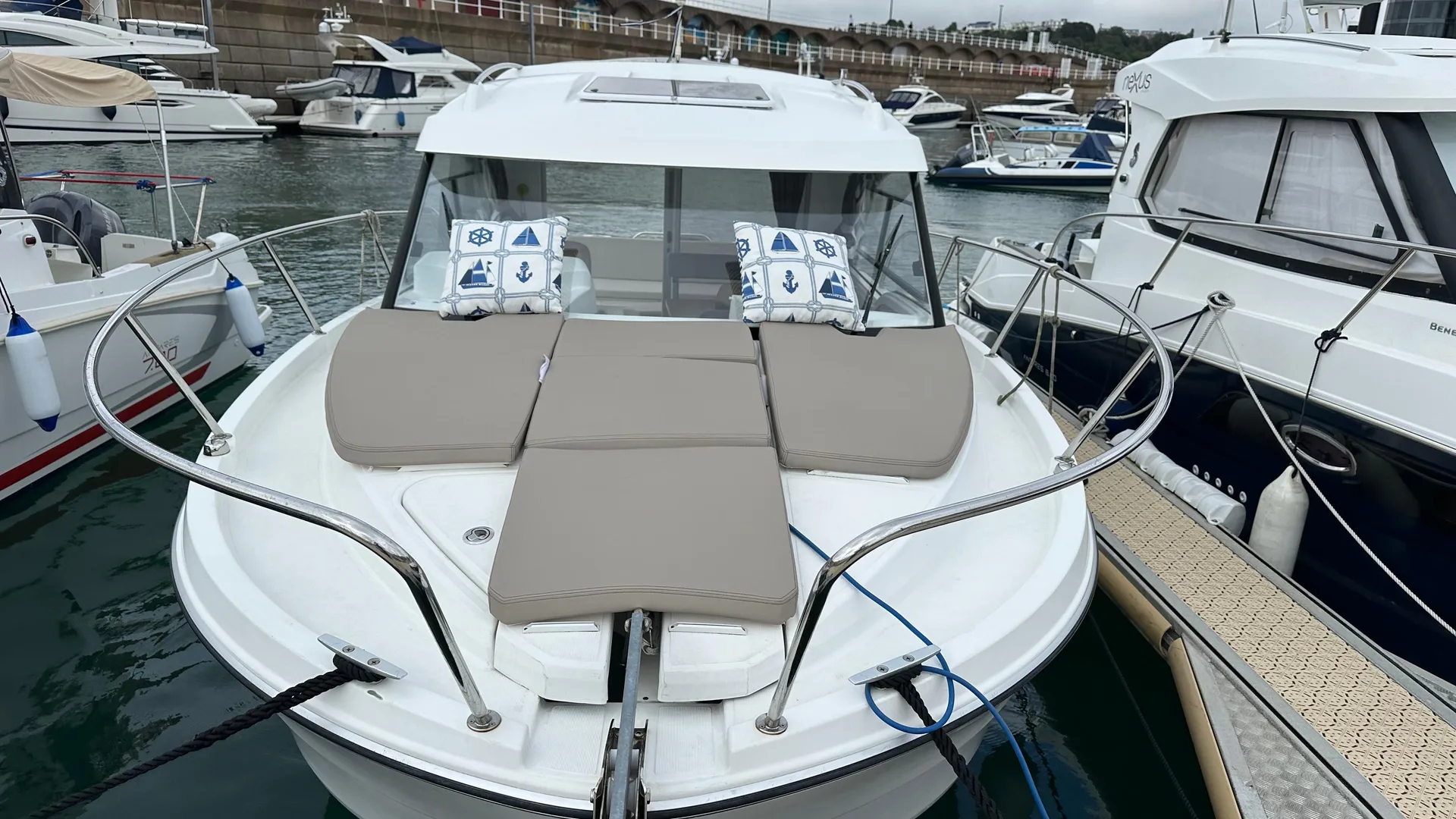 Description: Agile, powerful and very habitable, the Antares 8 oozes character. The ideal boat for exploring new shores, she is wonderful for taking a break for a few days, confident that you are completely safe. The Antares 8 has a new flared-out hull that delivers wonderful driving sensations, while boasting excellent seakeeping. The dynamic V design of the cap clearly announces the boat s stunning aesthetic design. Its clever deck plan offers three different possible cockpit seat layouts.Unique on a boat this size, the Antares 8 s habitability sets it apart from other motor cruisers in this category. The wheelhouse is accessed by a large sliding glass door, sheltering a well-equipped modular living space. There is a real double cabin below the wheelhouse at the bow of the boat, with storage and a shower en suite, so you can stay on board for a few days. With walnut stained woodwork, the boat offers a very contemporary atmosphere. Fully serviced and available now through Quay Boats, St Helier, Jersey