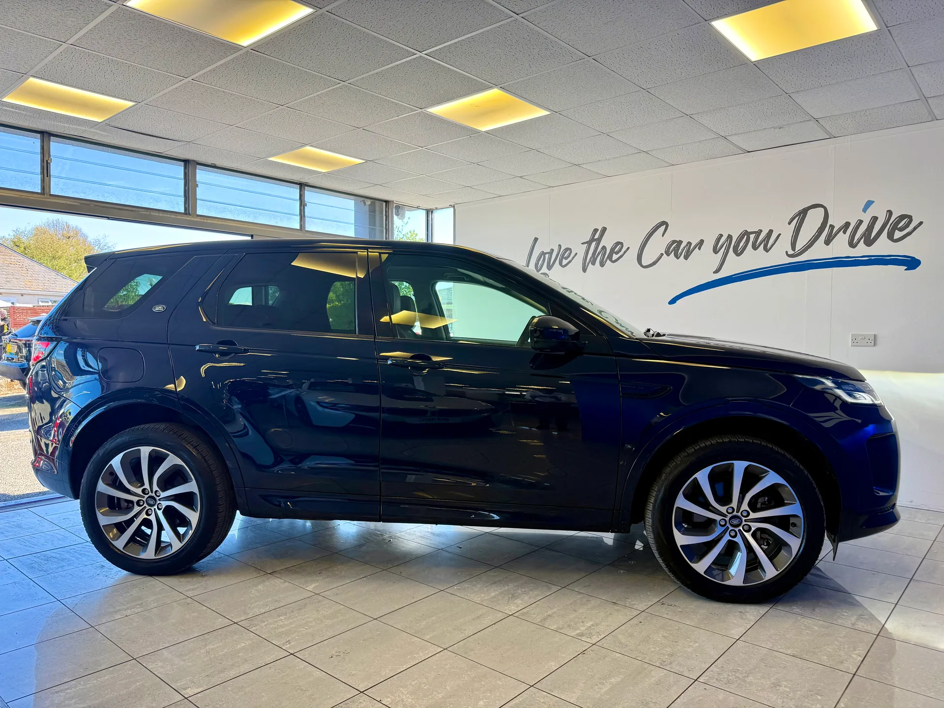 2021 Land Rover Discovery Sport P300e HSE R Dynamic, a plug-in hybrid SUV with a panoramic glass sunroof, heated front seats, and Meridian premium audio. Finished in Portofino Blue paint with 20" alloy wheels, this car offers a luxurious interior and exterior design. With low mileage and A1 condition, it's a great example of this rare model.