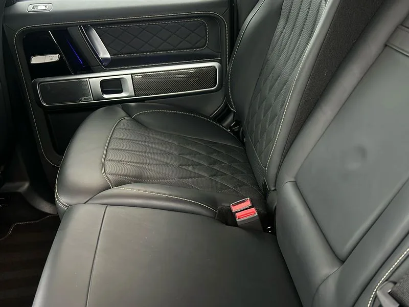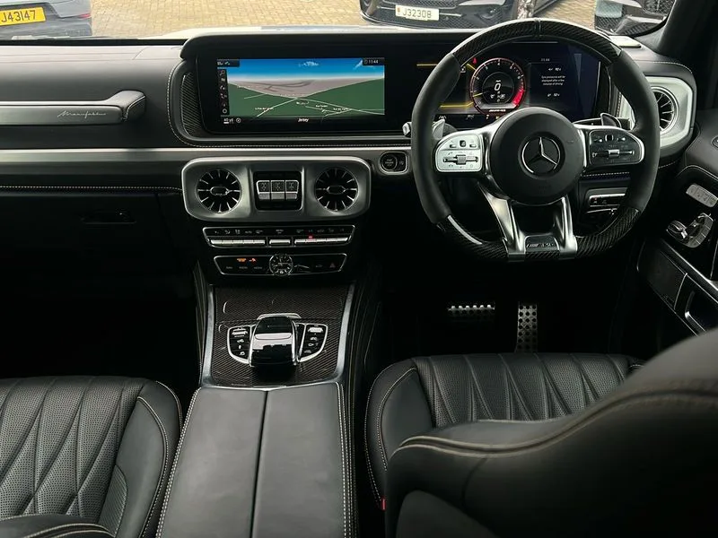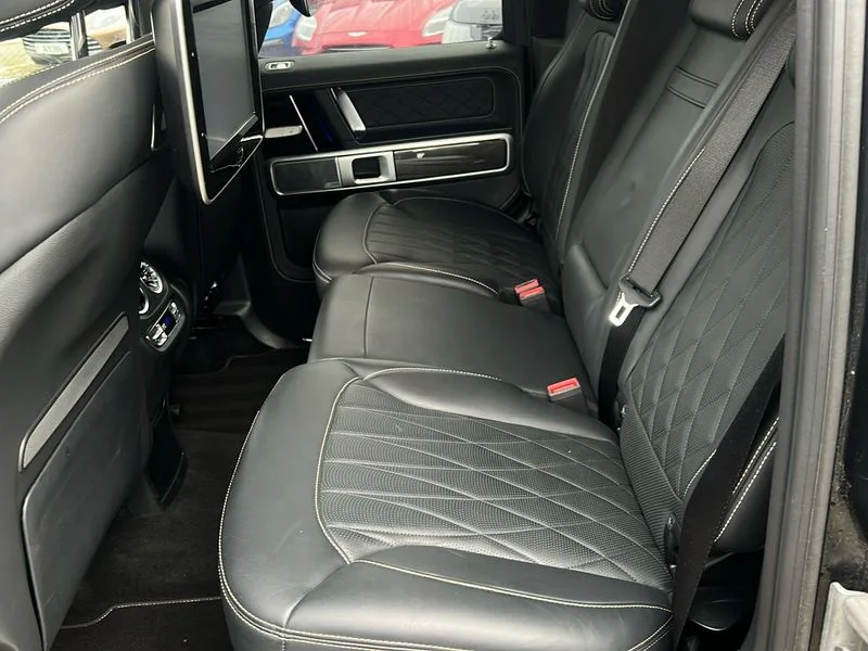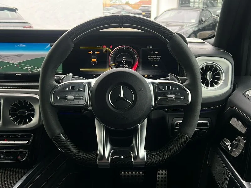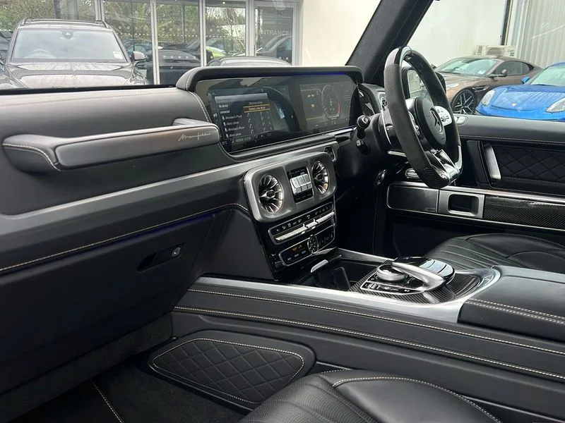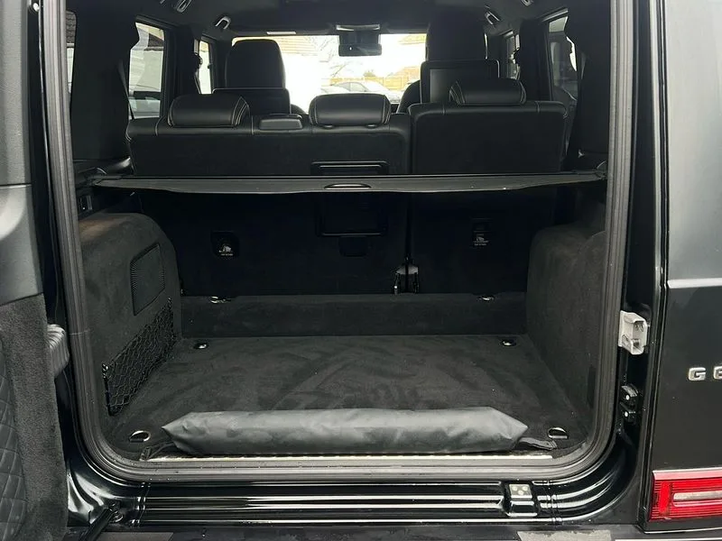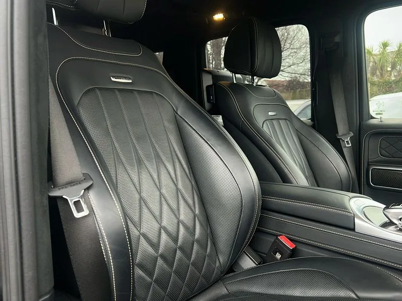 • 360 degree parking camera • Active lane keep assist • AMG DYNAMIC SELECT with ECO start/stop and 5 modes (comfort, slippery, sport, sport+ and manual) • AMG instrument cluster with dual bonded 12.3" widescreen displays • AMG specific IWC design analogue clock • Attention assist • Bluetooth interface for hands free telephone • COMAND online HDD Nav with media interface, radio/CD/DVD/MP3, 12.3" screen, linguatronic voice control • Communications module (LTE) • Mercedes connect me • Mercedes-Benz emergency call • Parking assistance PARKTRONIC • PAS • Preinstallation for rear seat entertainment • Service indicator (ASSYST) • Smartphone integration with Apple CarPlay and Android auto • Touch pad controller for COMAND online • Traffic sign recognition • Trip computer • Aux-in socket • Burmester surround sound system with 16 speakers • DAB digital radio module • 3rd brake light • Adaptive highbeam assist plus - automatic low high beam switching • AMG bodystyling with exclusive Mercedes AMG G 63 front aprons with cooling air intakes and AMG flared wheel arches in vehicle colour • AMG performance exhaust system, selectable ,left and right two chrome trimmed twin tailpipes • Automatic headlamp activation • Automatically dimming rear view mirror • Dark tinted heat insulated glass • Door mirror memory • Door mirrors - Electrically adjustable/heated/integrated indicators, front area lighting and automatically dimming driver's mirror • Electric sunroof sliding, with one-touch opening • Front and rear electric windows • Heated windscreen • LED daytime running lights • LED tail lights • Multibeam LED headlights with anti-dazzle feature • Privacy glass - Dark glass from B-pillar backwards • Rain sensor windscreen wipers • Rear side wing doors • Rear wiper • Running boards • Stainless steel spare wheel cover • Tail lights featuring LED technology • Trailer coupling with ESP trailer stabilisation • V8 BITURBO lettering • 1/3 to 2/3 split folding rear seats • 12V socket in centre console, rear and load compartment • 2 cup holders in front and rear • 3 seat bench in 2nd row • 3 spoke flat bottom AMG performance steering wheel in carbon fibre/DINAMICA microfibre • Ambient lighting with 64 colours and projection of brand logo • AMG floor mats with AMG lettering • AMG metal badge on front seat backrest • AMG steering wheel buttons • Centre armrest between front seats with integrated stowage compartment • Designo dinamica microfibre roof lining in Black • Door centre panels, door trim, armrests in doors with nappa leather • Electric front headrests with memory • Electric front seats with memory function • Electrically adjustable steering column, with automatic adjustment for entry/exit • Front centre armrest with storage compartment • Heated front seats • Heated rear seats • Heated steering wheel • Illuminated AMG door sill panels in brushed stainless steel • Ionisation of interior air including fine particle activated charcoal filter system • Load protection net • Luggage compartment cover • Memory for steering wheel • Rear head restraints • Rubber mat for load compartment • Silver air vents • Silver chrome steering wheel trim with AMG lettering + silver aluminium shift paddles + 12 o clock marking and touch control buttons • Single front passenger seat • THERMOTRONIC automatic climate control • 4MATIC permanent four wheel drive • AMG Ride Control suspension • AMG SPEEDSHIFT 9G Tronic sports transmission with cruise control and variable speed limiter • Differential lock • Electronic selectable low range gearing • Low range gear reduction (Electronically selectable while driving) • Petrol Particulate Filter • Driving assistance pack - G Class • Stowage space pack - G class • 3x3 point rear seatbelts • ABS with Brake Assist • Active brake assist • Adaptive brake with hold finction, priming and dry parking in the wet • Airbags - windowbags • AMG high performance braking system with internally ventilated and perforated brake discs • Driver/Front Passenger airbags • Electronic four wheel traction control • ESP with ASR • Front side airbags • Hill start assist • i-Size and ISOFIX rear child restraint system • Pre-safe system for anticipatory occupant protection • Rear door child safety locks • Rear side airbags • Red painted AMG brake calipers • Seat belts, 3-point design in black • Seatbelt pretensioners • Tyre pressure monitoring system • Anti-theft alarm system/interior protection with tow-away protection and interior monitoring systems • Immobiliser • Keyless Go access/ignition system • Remote central locking • AMG carbon fibre trim • Full size spare wheel