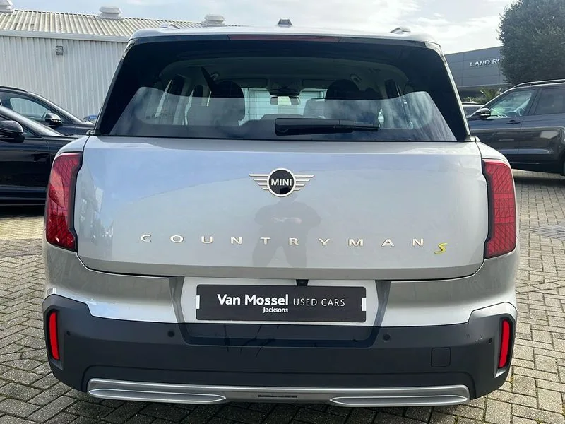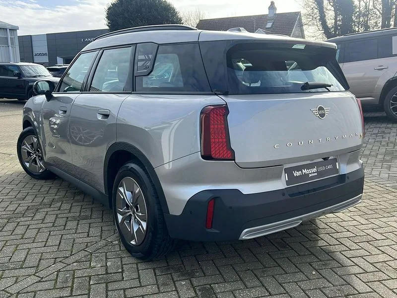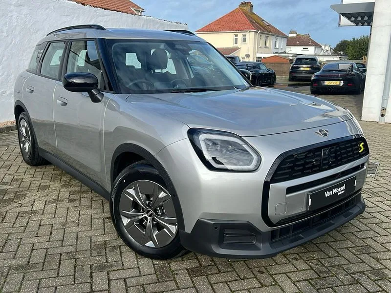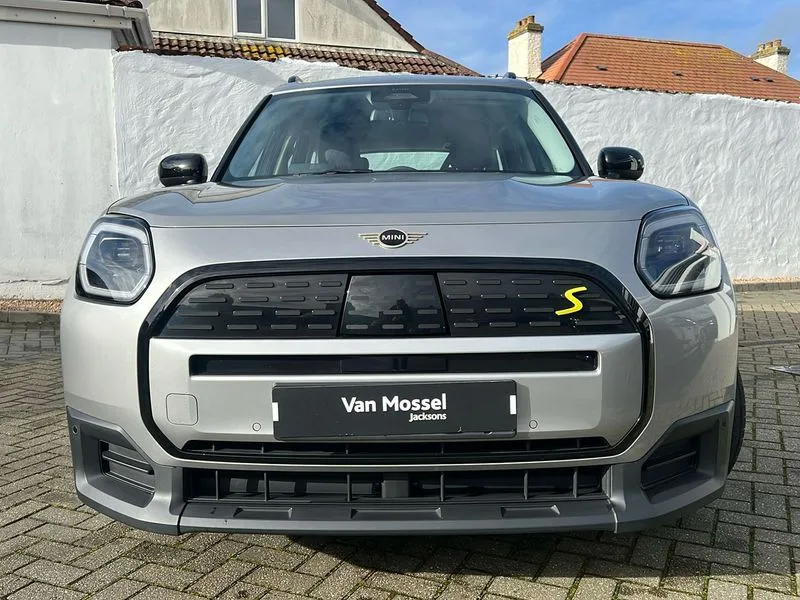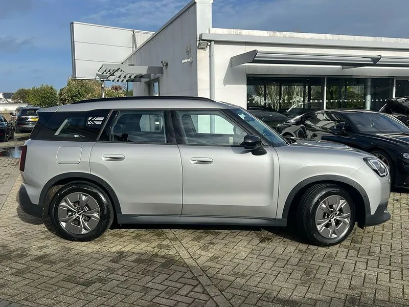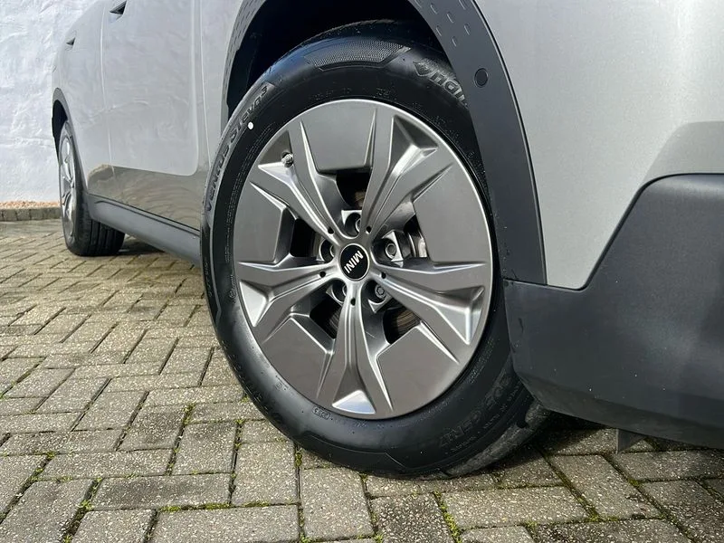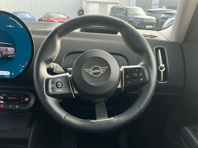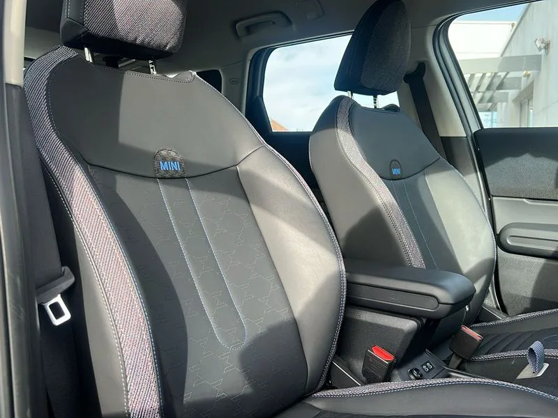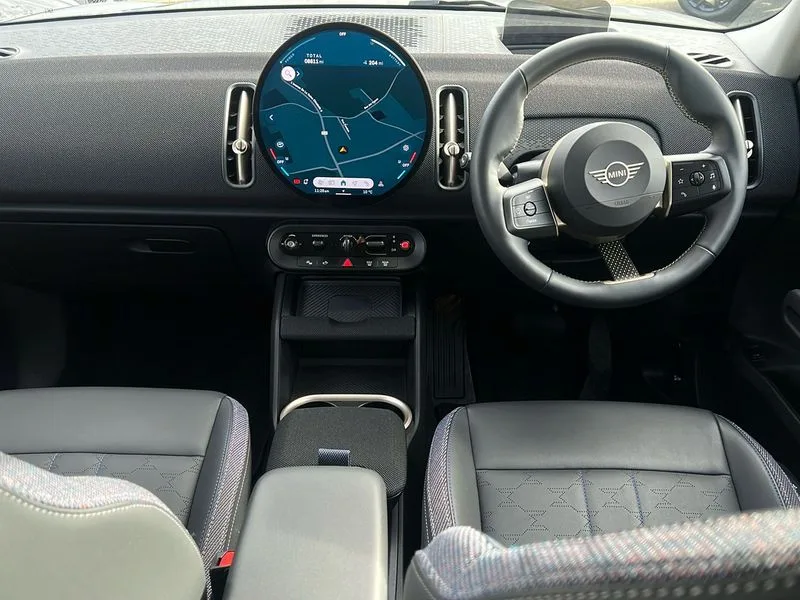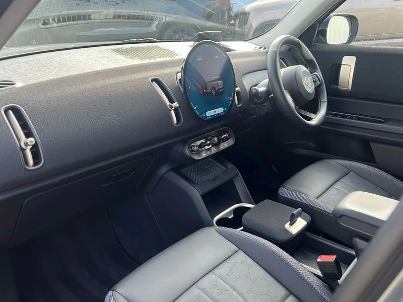 • Bluetooth connection • Circular OLED Screen • Compatible mobile phone bluetooth with audio streaming • Cruise Control (DCC) • Digital dashboard display • Driving assistant • Driving Assistant Plus Preparation • E-call • Electro-mechanical speed dependant steering assistance • MINI Experience Modes • MINI Head up display • Mini navigation system • MINI TeleServices • Parking assistant in camera and ultrasound based assistance system, rear view camera, parking aid and distance control • 6 speakers • DAB Digital radio • Personal eSim • Auto tailgate • Electric adjustable heated door mirrors • Front and rear electric windows • Heated rear window • High beam assistant • Interior rear-view mirror with automatic anti-dazzle function • LED daytime running lights • LED headlights with extended contents including Adaptable light signatures • LED rear lights • LED third brake light • Rain sensor with auto headlights • Rear side wing doors • Rear window wiper • Roof rails • 3 seat bench in 2nd row • 60/40 split rear bench seat • Auto air conditioning • Driver and front passenger seat heating • Floor mats • Front armrest • Front headrests • Heated steering wheel • Height and length steering column adjustment • Light headliner • Luggage compartment separating net • Rear headrests • Single front passenger seat • Sport Vescin Steering Wheel • Sunvisors with vanity mirrors • Vescin/Cloth upholstery • Wireless charging tray • 11kW AC charging • DC Rapid charging • Mode 3 charging cable • Interior and exterior mirror package - Mini Countryman • 3x3 point rear seat belts • 6 Airbags - front, side, head and seat belt tensioners • ABS • Acoustic pedestrian protection • DSC - Dynamic Stability Control • Electronic handbrake • Electronic Stability Programme (ESP) • Front ISOFIX (iSize) • Hill descent control • Hill hold assist • Hill start assist • Manual rear child locks • Traction control • Tyre pressure monitoring system • Warning triangle • Alarm system with tilt sensor, monitoring doors, bonnet interior and tailgate • Auto drive away locking • Comfort access system • Deadlocking function • Electronic vehicle immobiliser • Keyless Go • Locking wheel bolts • Remote control locking • Black/Blue dashboard knit • MINI Mobility Kit