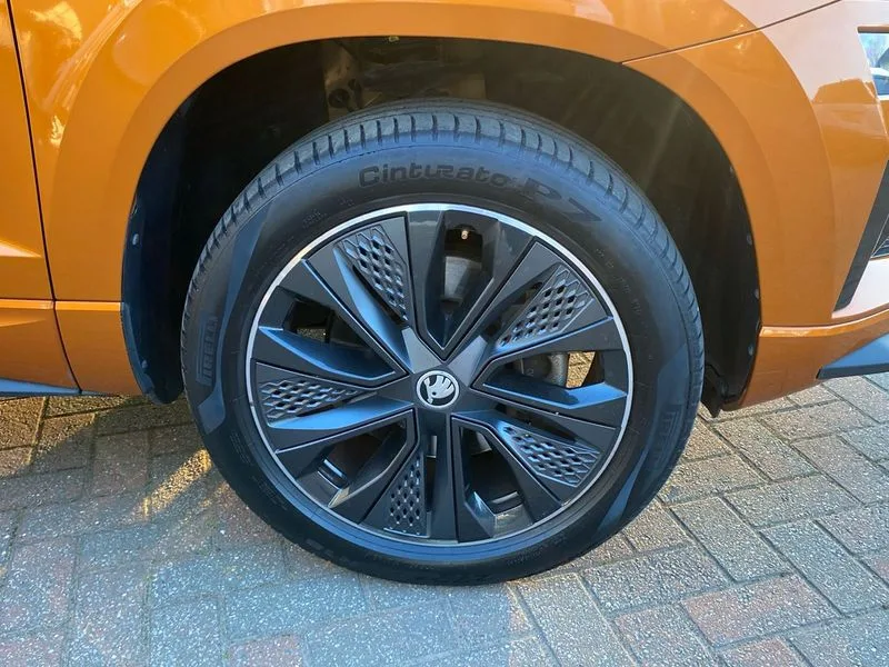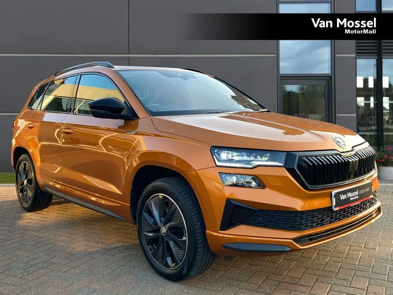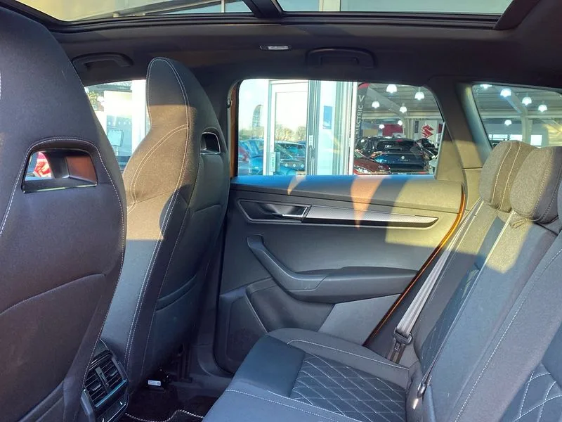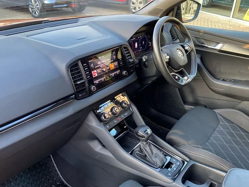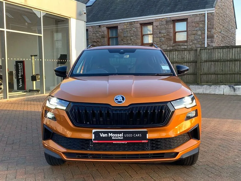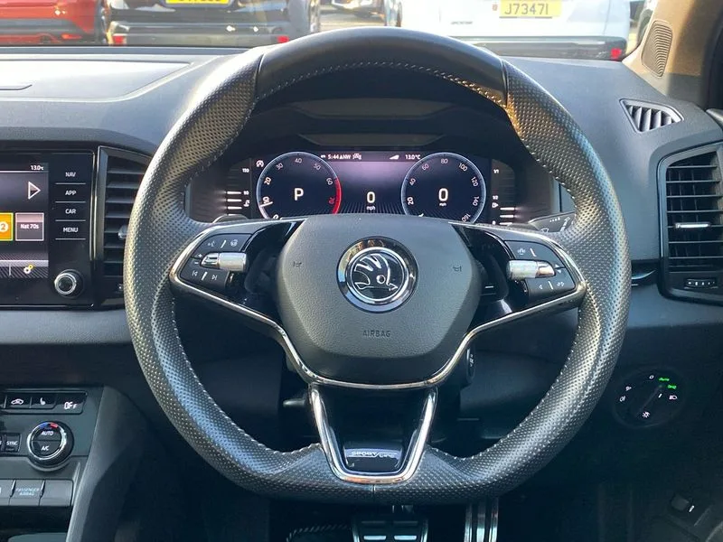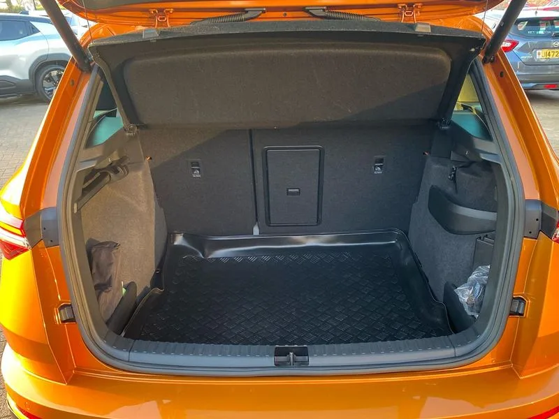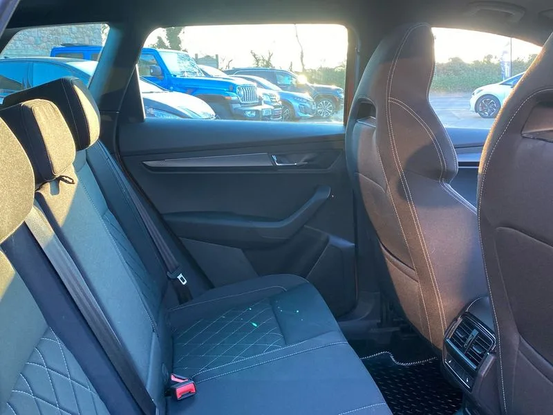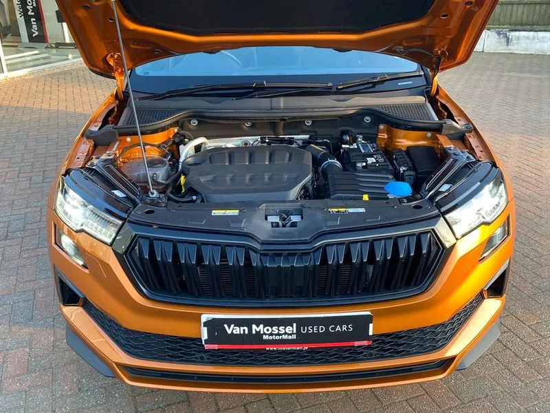• Care connect • Drive mode selection with off road • Driver fatigue sensor • Multifunction colour trip computer • Outside temperature gauge • Service interval indicator • SmartLink wireless for Apple and wired for Android • Start/stop system with regenerative braking • USB C Port x 2 in front centre console • DAB radio with Bluetooth • USB connection • Wireless charging without wireless aerial connection • Acoustic glass • Aero front windscreen wipers with intermittent function • Automatic headlight control system • Black door mirrors • Black electric window control buttons • Black radiator grille • Black roof rails • Body colour door handles • Body coloured bumpers • Electric front and rear windows with child proof lock • Front door steps with SportLine logo • Full LED headlights + adaptive front light system + LED daytime running lights and front cornering fog lights • Headlight washers • Heated rear windscreen • LED rear lights with high functionality • Light assistant (coming/leaving home/tunnel light) • Panoramic sliding sunroof • Privacy glass • Protective door side sills in body colour • Rear diffuser • Safety reflectors on front doors • Skoda lettering on tailgate in black • Sportline badge on front fender • Sportline decorative inserts with badging • Sports front and rear bumpers • Third brake light • 1.5 litre bottle holders in driver and front passenger door panels • 12V socket in boot • 12v socket in front centre armrest with storage compartment and rear air vents • 2 Folding hooks and nets in boot • 2 Front readings lights for driver and passenger • 3 rear height adjustable headrests • 4 foldable roof handles with rear coat hooks • Aluminium pedals • Black roof headlining • Cargo elements in boot • Chrome inner door handles • Door sill scuff plates • Driver and passenger seats height adjust • Front head restraints • Height adjustable front three point seats belts with tensioners • Height/reach adjust steering wheel • Ice scraper • Illuminated and cooled glovebox • Illuminated luggage compartment • Isofix child seat preparation outer rear • Manual lumbar support for front seats • Net programme in boot • Pen holder • Pollen filter • Rear reading lights • Rear seats fixed folding and divided 60:40 • Retractable parcel shelf attachable to tailgate • Safety vest holder • Solid rear boot cover • Storage box in upper central dashboard closed • Storage compartment below the passenger seat • Sunvisors with illuminated vanity mirrors • Textile floor mats • Umbrella under passenger seat • Welcome animation with sportline logo • LED Interior lighting pack with Skoda welcome logo - Karoq • Airbags - Front side, head, knee and curtain • Automatic door unlocking in case of crash • Automatic fuel cut off in case of crash • Driver airbag • Electronic parking brake with auto hold function • Emergency rear braking signal • ESC including ABS, MSR, ASR, EDS, HBA, DSR, RBS, MKB and traction control • Front assist radar scanning of the space in front of the car with automatic braking • Hill hold control • Passenger airbag with switch-off function • Pedestrian monitor • Seatbelt reminder signalisation and pretensioner for all seats • Three point seatbelts rear • Two tone horn • Tyre pressure display • Tyre pressure monitor • Alarm with interior monitoring, back up horn and tilt sensor with safe function • Electronic engine immobiliser • Keyless entry and keyless start with safe system • Remote central locking with 2 remote folding keys • Black air vent surround • 19" Vega anthracite alloy wheels • Anti-theft wheel bolts protection • Storage on wheel cover