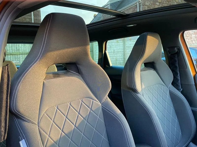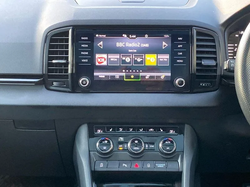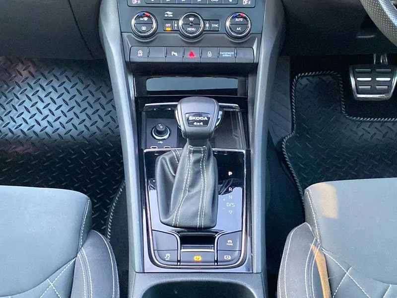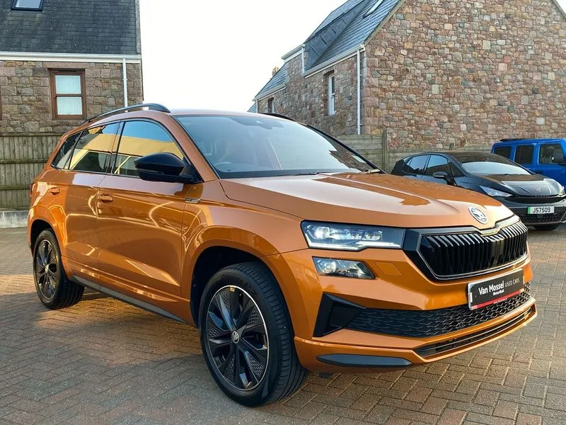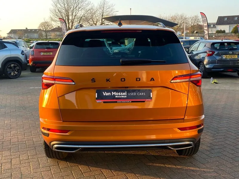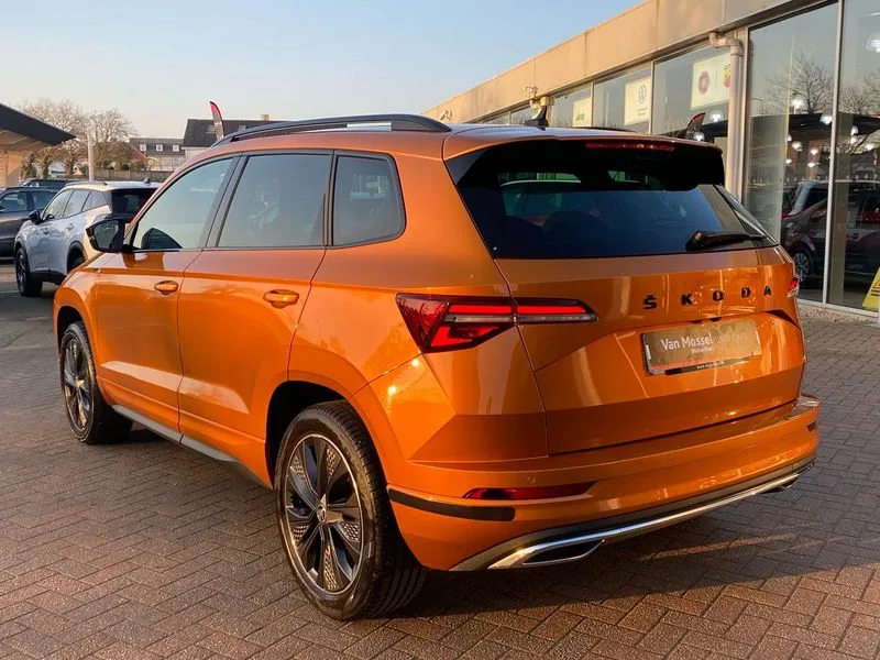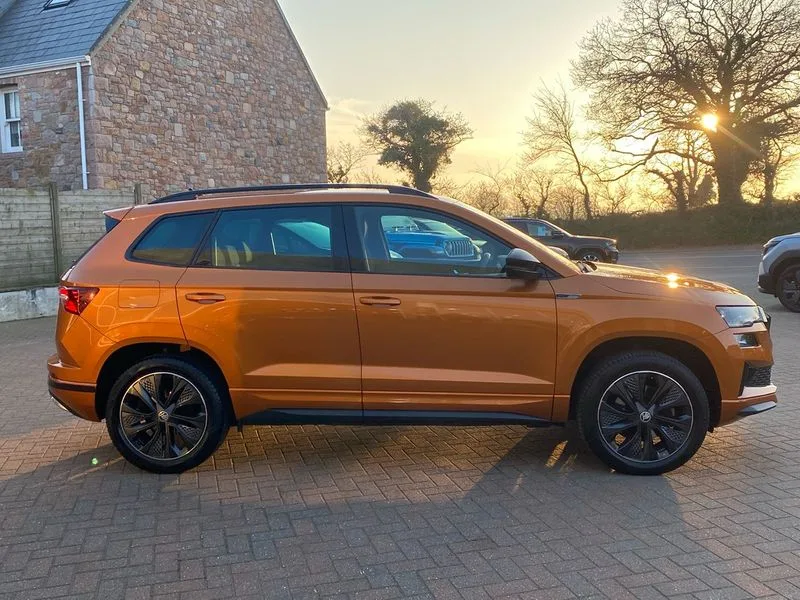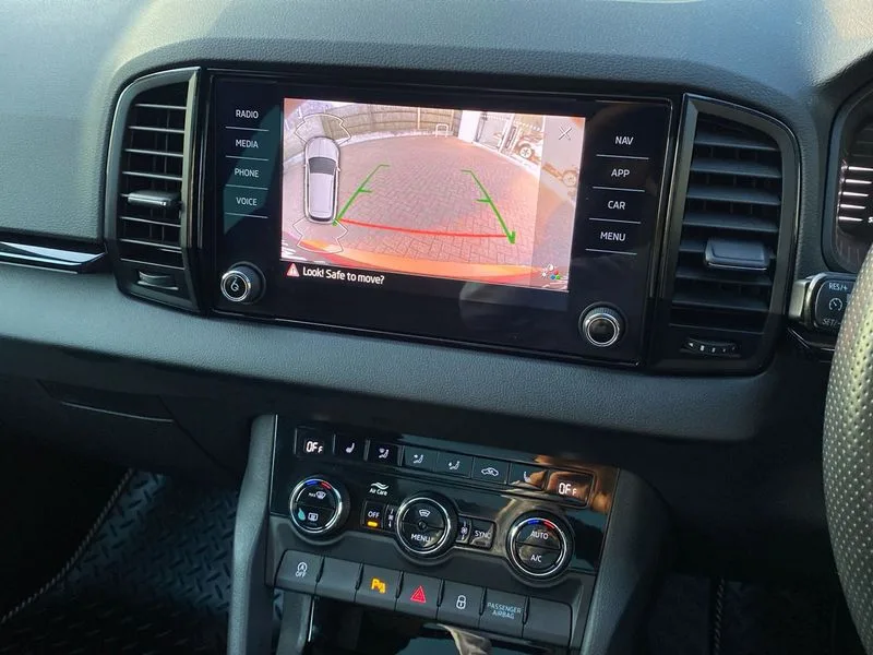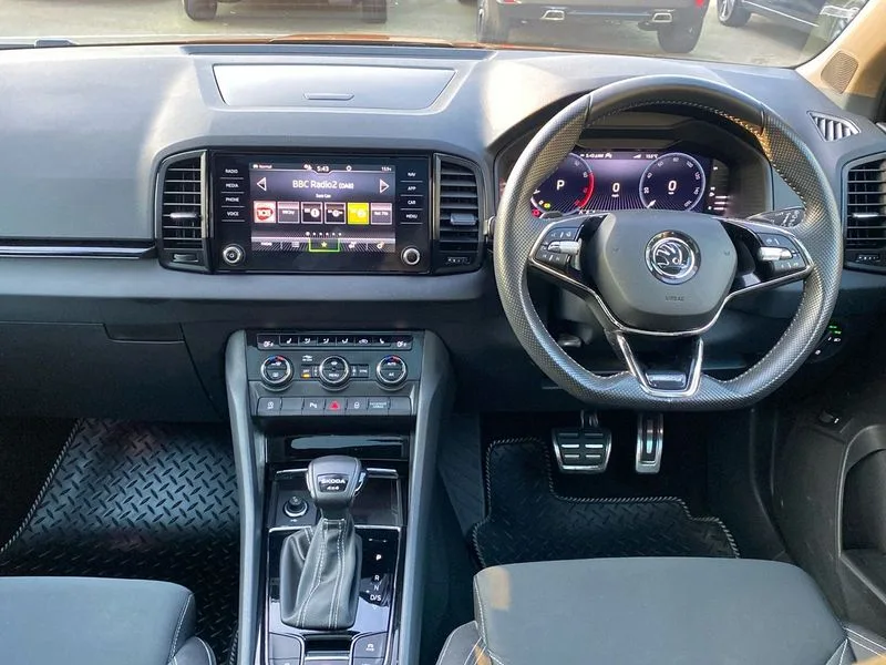• Care connect • Drive mode selection with off road • Driver fatigue sensor • Multifunction colour trip computer • Outside temperature gauge • Service interval indicator • SmartLink wireless for Apple and wired for Android • Start/stop system with regenerative braking • USB C Port x 2 in front centre console • DAB radio with Bluetooth • USB connection • Wireless charging without wireless aerial connection • Acoustic glass • Aero front windscreen wipers with intermittent function • Automatic headlight control system • Black door mirrors • Black electric window control buttons • Black radiator grille • Black roof rails • Body colour door handles • Body coloured bumpers • Electric front and rear windows with child proof lock • Front door steps with SportLine logo • Full LED headlights + adaptive front light system + LED daytime running lights and front cornering fog lights • Headlight washers • Heated rear windscreen • LED rear lights with high functionality • Light assistant (coming/leaving home/tunnel light) • Panoramic sliding sunroof • Privacy glass • Protective door side sills in body colour • Rear diffuser • Safety reflectors on front doors • Skoda lettering on tailgate in black • Sportline badge on front fender • Sportline decorative inserts with badging • Sports front and rear bumpers • Third brake light • 1.5 litre bottle holders in driver and front passenger door panels • 12V socket in boot • 12v socket in front centre armrest with storage compartment and rear air vents • 2 Folding hooks and nets in boot • 2 Front readings lights for driver and passenger • 3 rear height adjustable headrests • 4 foldable roof handles with rear coat hooks • Aluminium pedals • Black roof headlining • Cargo elements in boot • Chrome inner door handles • Door sill scuff plates • Driver and passenger seats height adjust • Front head restraints • Height adjustable front three point seats belts with tensioners • Height/reach adjust steering wheel • Ice scraper • Illuminated and cooled glovebox • Illuminated luggage compartment • Isofix child seat preparation outer rear • Manual lumbar support for front seats • Net programme in boot • Pen holder • Pollen filter • Rear reading lights • Rear seats fixed folding and divided 60:40 • Retractable parcel shelf attachable to tailgate • Safety vest holder • Solid rear boot cover • Storage box in upper central dashboard closed • Storage compartment below the passenger seat • Sunvisors with illuminated vanity mirrors • Textile floor mats • Umbrella under passenger seat • Welcome animation with sportline logo • LED Interior lighting pack with Skoda welcome logo - Karoq • Airbags - Front side, head, knee and curtain • Automatic door unlocking in case of crash • Automatic fuel cut off in case of crash • Driver airbag • Electronic parking brake with auto hold function • Emergency rear braking signal • ESC including ABS, MSR, ASR, EDS, HBA, DSR, RBS, MKB and traction control • Front assist radar scanning of the space in front of the car with automatic braking • Hill hold control • Passenger airbag with switch-off function • Pedestrian monitor • Seatbelt reminder signalisation and pretensioner for all seats • Three point seatbelts rear • Two tone horn • Tyre pressure display • Tyre pressure monitor • Alarm with interior monitoring, back up horn and tilt sensor with safe function • Electronic engine immobiliser • Keyless entry and keyless start with safe system • Remote central locking with 2 remote folding keys • Black air vent surround • 19" Vega anthracite alloy wheels • Anti-theft wheel bolts protection • Storage on wheel cover