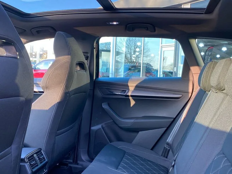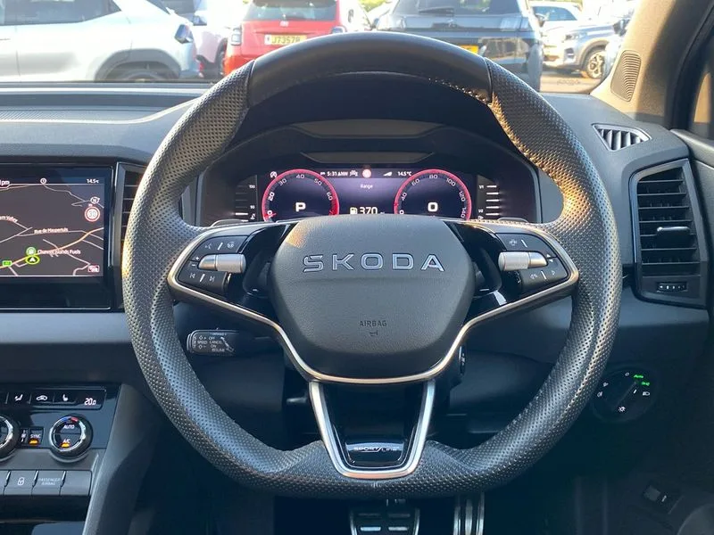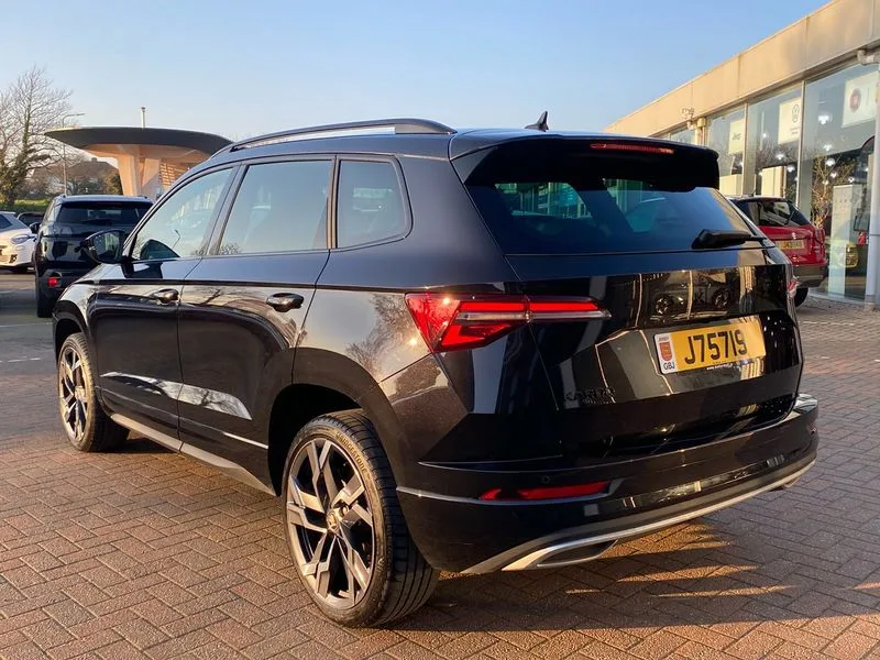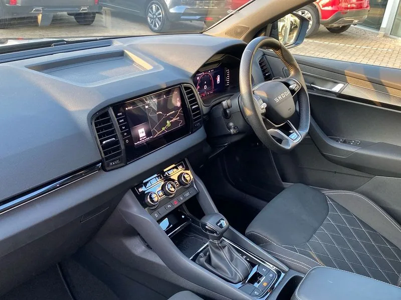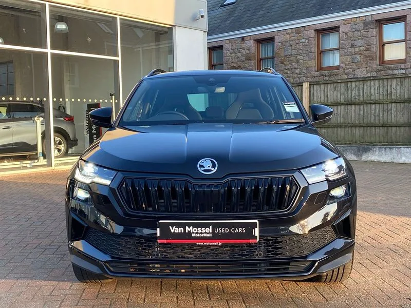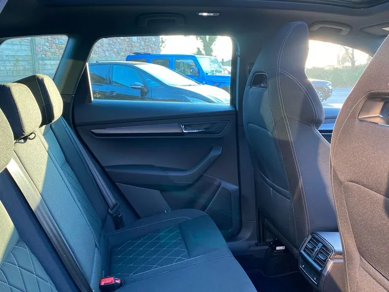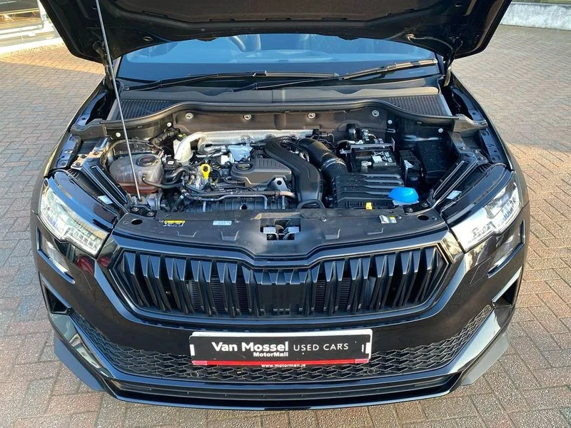 • Advanced driver attention and drowsiness monitor • Emergency services call system • Outside temperature gauge • Sensor for driver assistance systems • Service interval indicator • SmartLink wireless for Apple and wired for Android • Start/stop system with regenerative braking • Traffic sign recognition • USB C Port x 2 in front centre console • Virtual Cockpit - 10.25" digital display • Virtual pedal with electrically operated boot door • Wireless smartphone charging • DAB radio with Bluetooth • USB connection • Acoustic glass • Aero front windscreen wipers with intermittent function • Auto dimming rear view mirror with light and rain sensors • Black door mirrors • Black electric window control buttons • Black radiator grille • Black roof rails • Body colour door handles • Electric front and rear windows with child proof lock • Extended rear roof spoiler • Front door steps with SportLine logo • Heated rear windscreen • LED daytime running lights • LED rear lights with high functionality welcome effect and dynamic indicators • Light assistant (coming/leaving home/tunnel light) • Panoramic sliding sunroof • Plastic scuff plates in door apertures • Privacy glass • Protective door side sills in body colour • Rear diffuser • Rear side wing doors • Rear window wiper with washer system and intermittent control • Safety reflectors on front doors • Skoda lettering on tailgate in black • Sportline badge on front fender • Sports front and rear bumpers • Third brake light • Unique dark chrome design logo on alloy wheels • 1.5 litre bottle holders in driver and front passenger door panels • 12V socket in boot • 12v socket in front centre armrest with storage compartment and rear air vents • 2 x Tablet holder • 3 rear height adjustable headrests • 3 seat bench in 2nd row • 3 spoke sports leather heated multifunction steering wheel with DSG paddles • 4 foldable roof handles with rear coat hooks • Black floor carpet • Cargo elements in boot • Chrome inner door handles • Foldable hooks in the boot • Front head restraints • Height adjustable front three point seats belts with tensioners • Height/reach adjust steering wheel • Ice scraper • Illuminated glovebox • Illuminated luggage compartment • Isofix child seat preparation for front passenger seat • Isofix child seat preparation outer rear • Manual lumbar support for front seats • Pen holder • Pollen filter • Rear backrest release from boot • Rear boot cover • Rear package tray • Rear reading lights • Rear seats fixed folding and divided 60:40 • Rubbish bin door • Safety vest holder • Single front passenger seat • Skoda lettering on steering wheel • Sportline decorative inserts • Storage box in upper central dashboard closed • Sunvisors with illuminated vanity mirrors • Textile floor mats • Ticket holder • Titan black interior ceiling • Umbrella under passenger seat • Under passenger seat storage compartment • Columbus pack - Karoq • LED Interior lighting pack with Skoda welcome logo - Karoq • Light Pack - Karoq • Non Smokers pack • Performance pack - Karoq • Winter plus pack with heated front and rear seats - Karoq • Automatic door unlocking in case of crash • Automatic fuel cut off in case of crash • Driver airbag • Electronic parking brake with auto hold function • Emergency rear braking signal • ESC (incl. ABS+MSR+ASR+EDS+HBA+DSR+RBS+MKB) • Front side airbags • Head airbags • Hill hold control • Knee airbags • Passenger airbag with switch-off function • Pedestrian monitor • Power operated child safety locks • Seatbelt reminder signalisation and pretensioner for all seats • Three point seatbelts rear • Two tone horn • Tyre pressure monitor • Alarm with interior monitoring, back up horn and tilt sensor with safe function • Electronic engine immobiliser • Keyless entry and start/stop • Remote central locking with 2 remote folding keys • Black air vent surround • Black centre console • carbon door decor • Satin black dashboard • Satin black door trim • 19" Sagittarius anthracite alloy wheels • Anti-theft wheel bolts protection • Breakdown and tool kit