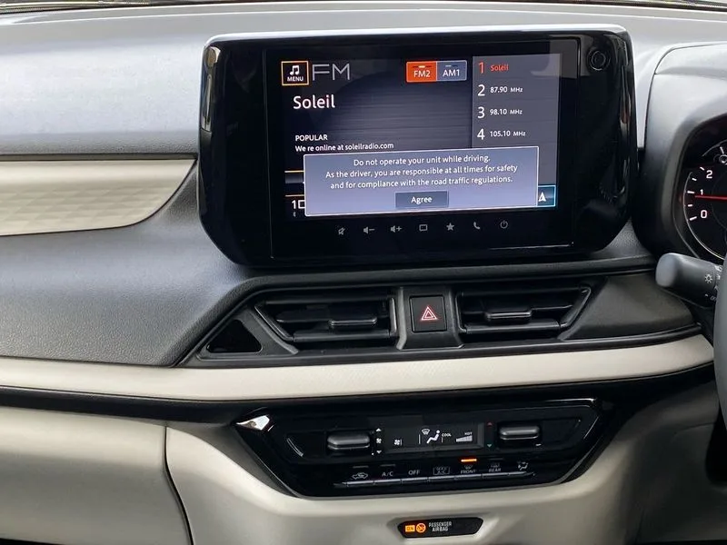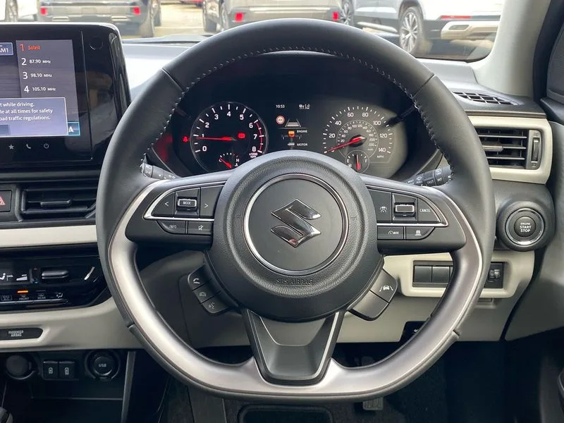 • Adaptive cruise control with Stop and Go • Automatic start/stop system • Blind spot monitoring • Colour LCD information display • Digital clock • Driver monitoring system • eCall • Fuel consumption display (average/instantaneous) and range display • Intelligent speed control support • Lane departure prevention • Lane departure warning system • Lane keeping assist (LKA) • Low fuel level warning light • Navigation system • Outside temperature display • PAS • Rear cross traffic alert • Rear parking camera • Rear parking sensors • Remote fuel cap release • Smartphone integration with Apple CarPlay and Android auto • Suzuki connect • Tailgate • Traffic sign recognition • Weaving alert • 4 speakers + 2 tweeters • 9-inch infotainment display • Auxiliary input socket • Bluetooth audio streaming • DAB Digital radio • Steering wheel audio controls • USB Type A and C • 'Guide me home' headlamps • 1 speed with intermittent rear wiper + washer • 2 speeds front wiper with intermittent + washer • Automatic headlights • Black coloured A & B pillars • Black Upper and lower front grille • Body colour door mirrors and handles • C pillar trim moulding • Electric door mirrors • Electric front windows • Electric rear windows • Green tinted glass • Heated door mirrors • High beam assist • LED daytime running lights • LED High mounted stop light • LED position lamps • LED projector headlamps • LED rear combination lamp • Manual headlamp level control • Rain sensor • Rear fog lights • Rear privacy glass • Rear side wing doors • Rear spoiler • Side spoiler • 1 cup holder in rear • 12V Accessory socket in front console • 2 cup holders in front • 2 Isofix seat anchors • 3 bench rear seats in 2nd row • 3 rear head restraints • 3 spoke leather covered steering wheel • 60/40 split rear seats • Accessory socket • Centre console storage • Centre lower box • Child seat tether anchorages x 2 • Chrome handbrake release button • Chrome interior door handles • Cloth upholstery • Door pockets with bottle holder • Driver/passenger sunvisors with ticket holders + vanity mirrors • Front cabin lights • Front headrests • Front map light • Front passenger side assist grip • Glovebox • Heated front seats • Heater • Height adjustable driver's seat • Luggage area lamp • Manual air conditioning with digital control panel • Material door trim ornament • Parcel shelf • Passenger seat back pocket • Pollen filter • Single front passenger seat • Tilt adjustable steering wheel • Tilt/telescopic adjustable steering wheel • 3 point ELR seatbelts for centre seat • 3 point ELR seatbelts front and rear • ABS+EBD+Brake assist • Curtain airbags • Driver airbag • Dual sensor brake support • ESP + traction control • Front and rear seatbelt reminder • Front passenger airbag • Front passenger airbag deactivation • Front seatbelt pretensioners with force limiters • Hill hold control • Rear child proof door locks • Rear seatbelts with pre-tensioners and load limiters • Side airbags with incorporated into front seats • Tyre pressure indicator • Deadlocks • Freewheeling key cylinders • Immobiliser • Keyless entry and start • Light - on and Key in reminder • Locking wheel nuts • Remote central locking • Painted instrument panel ornament • 16" Painted alloy wheels