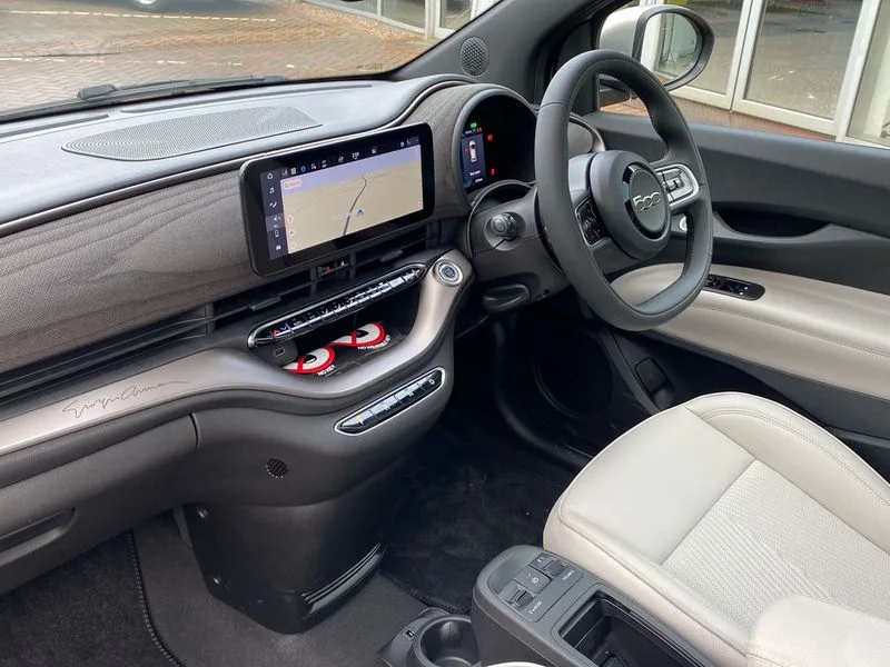 • 10.25" touchscreen infotainment with navigation • 360 degree parking sensors • 7" TFT digital cluster • Attention assist • Blind spot warning • Bluetooth connectivity • Central Console A+C USB (Charging Only) • Connected services • E-call • e-coasting • EV Granted Range (Take Me Home) • EV indications on instrument cluster and head unit • EV Low Battery Mode (Turtle Mode) • EV mode selector • Fiat Co-Driver (Autonomous Driving L2 with iACC, lane centering and traffic jam assist) • Intelligent speed assist • Lane keeping assistant (LKA) • Power assist steering • Quick Guide English • Rear view parking camera • Traffic sign information • Traffic sign recognition • Uconnect live service • Vehicle Start Button • Voice recognition • Warranty handbook uk • Wireless apple car play/android Auto • Wireless Mobile Phone Charger • DAB radio • Global telematics box module (TBM) • JBL premium audio system • USB for device mirroring in 1st row • Automatic headlights • Automatic high/low beam • Black upper window surround • Body colour electric adjustable heated door mirrors • Body colour side mouldings • Chromed daylight opening • Cristalli Atermici • Dark tinted windows: rear + rear side • Electrochromatic rear view mirror • Fixed glass roof with sunblind • Full LED Infinity design headlamps • Heated rear window • Heated windshield • LED 3rd brake light • LED daytime running lights • LED Indicators • LED rear lights • LED reverse light • LED side lights • Naval transport cover • One touch up/down power windows • Pearl effect paint • Plate with signature Giorgo Armani • Rain sensing wipers • Rear Fiat logo body color • Rear fog light • Rear wiper • Sill plates with GA signature • Welcoming / Leaving lights • 2 seat bench in second row • 50/50 split folding rear seat • 6 way manually adjustable drivers seat • Automatic air conditioning • Auxilliary 12V power socket • Bi-colour eco leather steering wheel • Boot light • Cabin pre-conditioning • Cargo box • Centre console storage with sliding and closing door • Dashboard white backlight • Eco leather with GA logo • Electrically driven temperature control • First Row Dome Lamp Incandescent • Floor mats • Front armrest • Front headrests • Heated front seats • Height adjustable steering wheel • LED spot light on central dashboard • One pedal drive • Passenger sun visor with mirror • Rear cup holders • Rear head restraints • Rigid cargo cover • Single front passenger seat • Steering wheel with audio controls • Telescopic steering column • 85kW fast charge • Bag for mode 3 charging cable • Electric transmission • Mode 3 charging cable • Second life ready battery • Smart charging • Smart charging port • 7 airbags - Driver, passenger, side, window and drivers knee airbags • ABS/EBD • Autonomous Emergency Brake (AEB) & Vulnerable Road User (VRU) Protection • Brake assist function • Curtain airbags • E-Braking • Electronic parking brake • ESC + ASR/MSR + HBA + Hill holder • Front and rear seatbelt reminder • Front passenger airbag deactivation • Low speed safety system • Tyre pressure sensor • Automatic door locking • Immobiliser • Keyless Go • Passive entry and wearable key • Remote central locking • Dashboard with GA signature • 17" Giorgo Armani alloy wheels • Bag for repair kit • Fix and go puncture repair kit